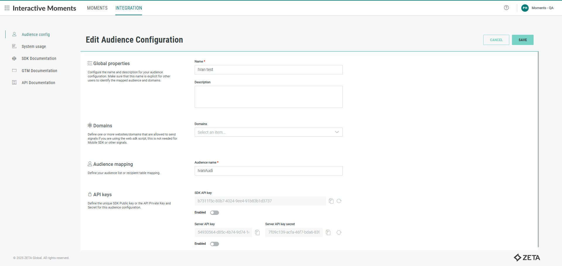 The Signals SDK authentication Key can be retrieved from the Audience configuration in the Moments application: