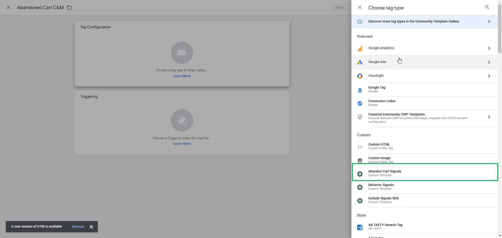 3. Choose a tag type from the list on the right. Select one of the custom Zeta templates that you have imported before. (example Abandoned Cart Signals):