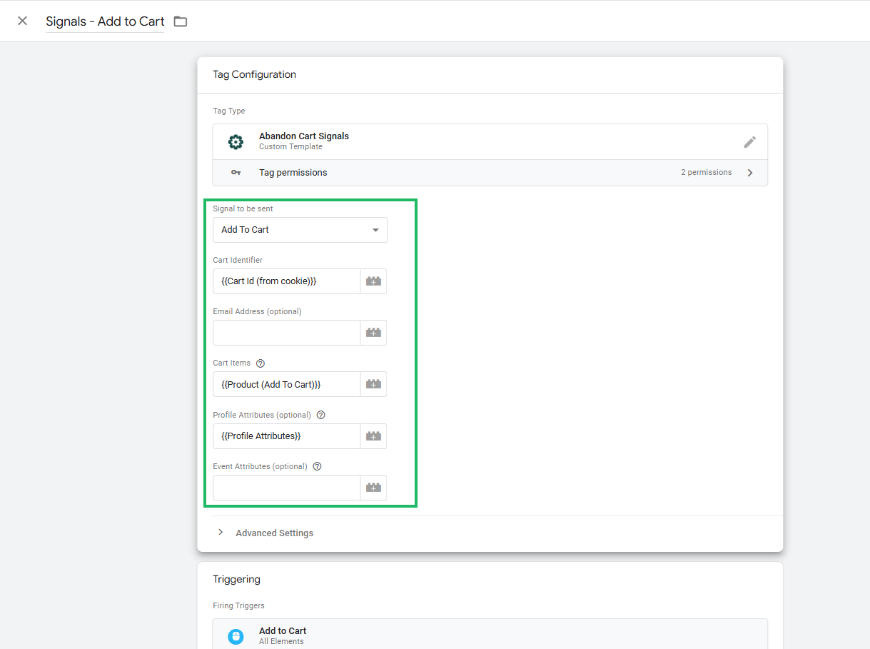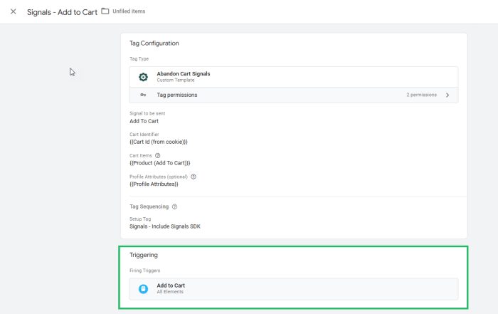 For the Abandon Cart Signals Tag, the following fields are listed