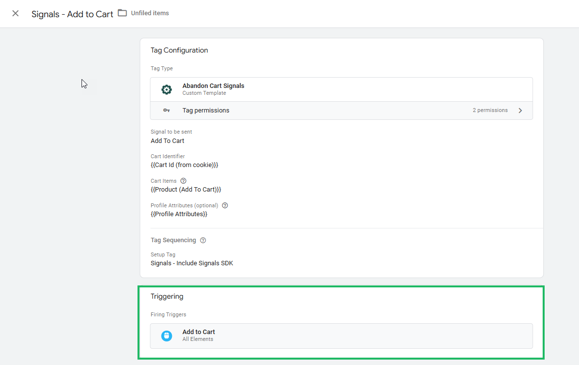 6. Last, a trigger can be linked to this tag. This trigger defines when the data needs to be sent to the signals API.