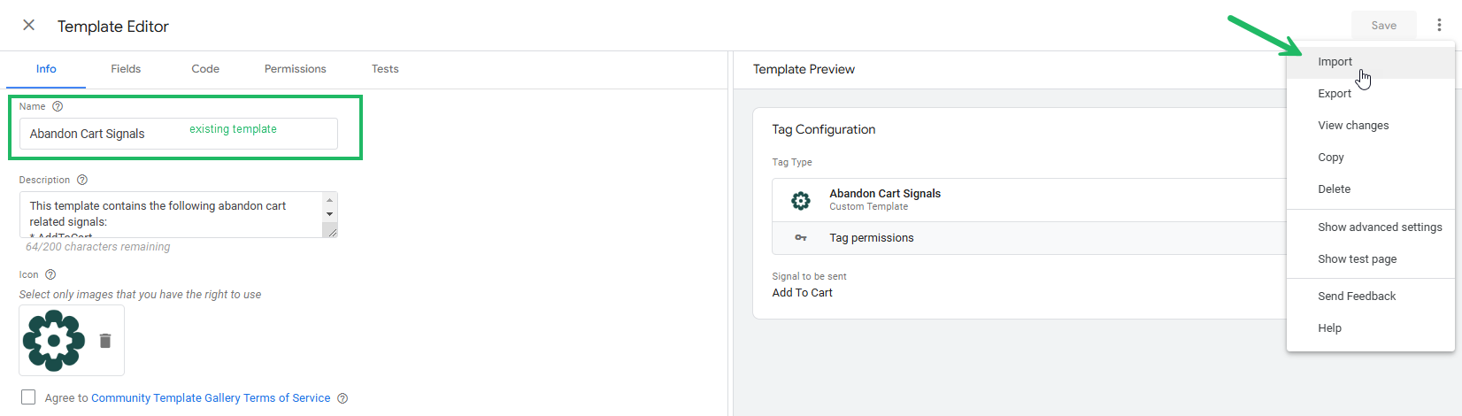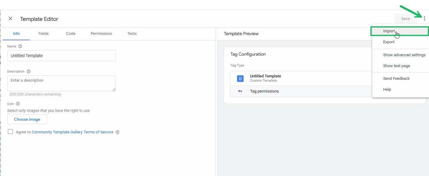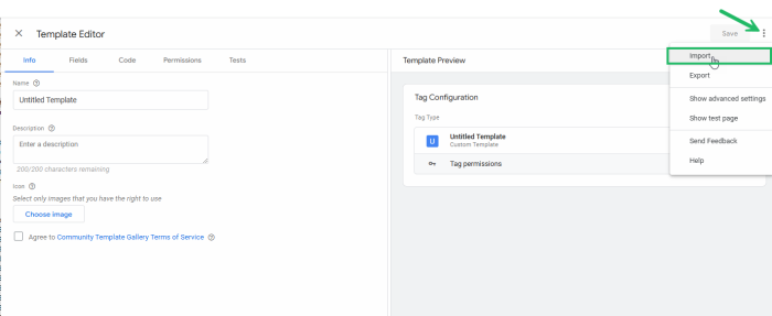 5. The Template editor is shown. Click the 3 dots in the upper right corner and select Import.