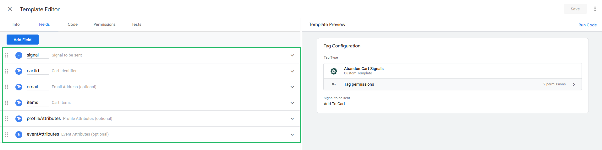 Example: In our demo environment, the Signals - Add to cart tag is based on the abandon Cart SDK template. The following fields are listed:![]()