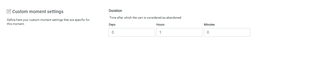 For an Abandon Cart Moment, a time delay needs to be specified, indicating after how many days, hours or minutes the Moment is triggered, for example, after 8 hours of inactivity on the cart.