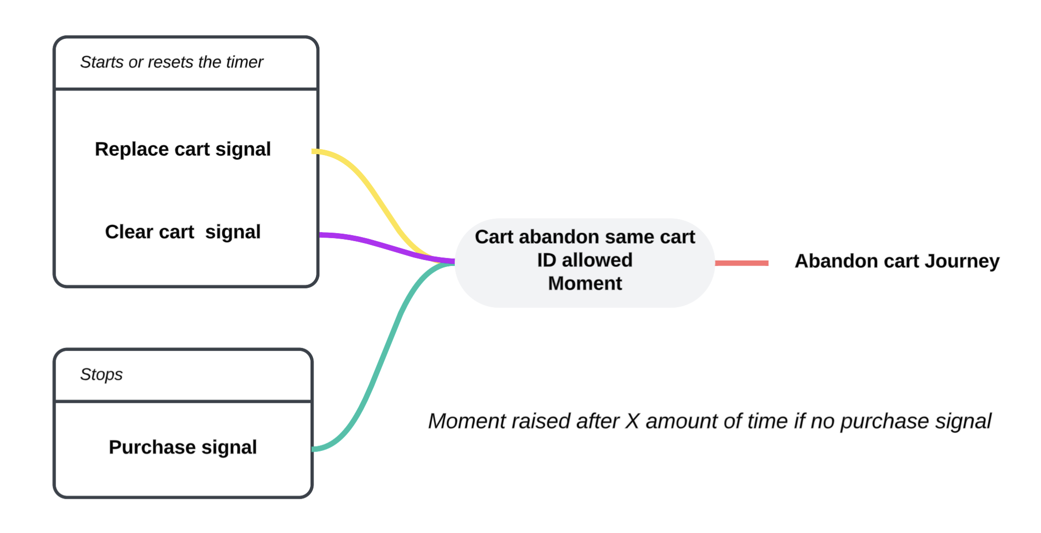 Note: The Cart Abandon moment can trigger multiple times for signals with the same CartId. This lets you enrich an existing Moment when the cart changes, for example when a customer replaces items after the Moment is raised. As a result, you can send multiple communications to the same customer profile for the same cart.
