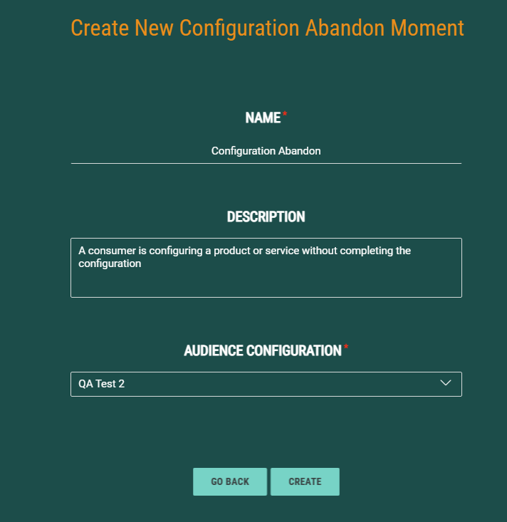 First create the Configuration Abandon Moment and fill out the name, description and select the Audience configuration to apply to this Moment.