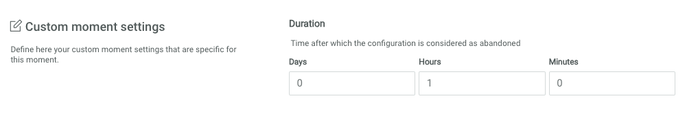 Duration — Set the time delay after which the configuration is considered as abandoned and the Moment is triggered, for example after 2 days of inactivity on the configuration.