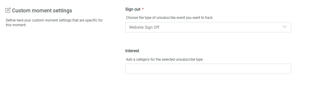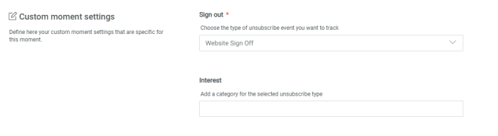 Next, you need to choose the type of Sign out event this Moment is used for. You can choose from Unsubscribe Newsletter, Unsubscribe Webinar, Unsubscribe Event, Unsubscribe Game, Website Sign off and Sign off for a loyalty program. This implies that the Moment will only listen to signals of that specific type.![]()