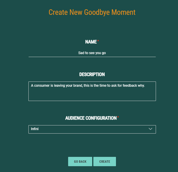 First create the Goodbye Moment and fill out the name, description and select the Audience configuration to apply to this Moment.![]()