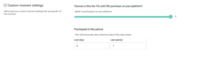 Number of purchases — This option allows you to select the number of purchases the customer has made to allow the moment to be triggered. Use the slider to choose between minimum 1 and maximum 5 purchases