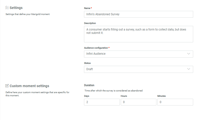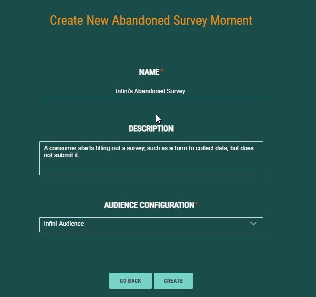 First create the Survey/Booking/Game Abandon Moment and fill out the name, description and select the Audience configuration to apply to this Moment.