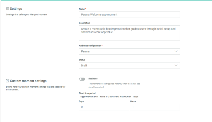 Fixed time period — Set the time delay, in days or hours, after the app installation when a message needs to be sent. Default is 1 hour. This option is only available when Real time has been toggled off.