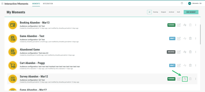 A technical marketer using the Moments solution, should have the ability to instantly view whether a signal has been triggered or a moment has been generated, for example for debugging purposes, in real-time.