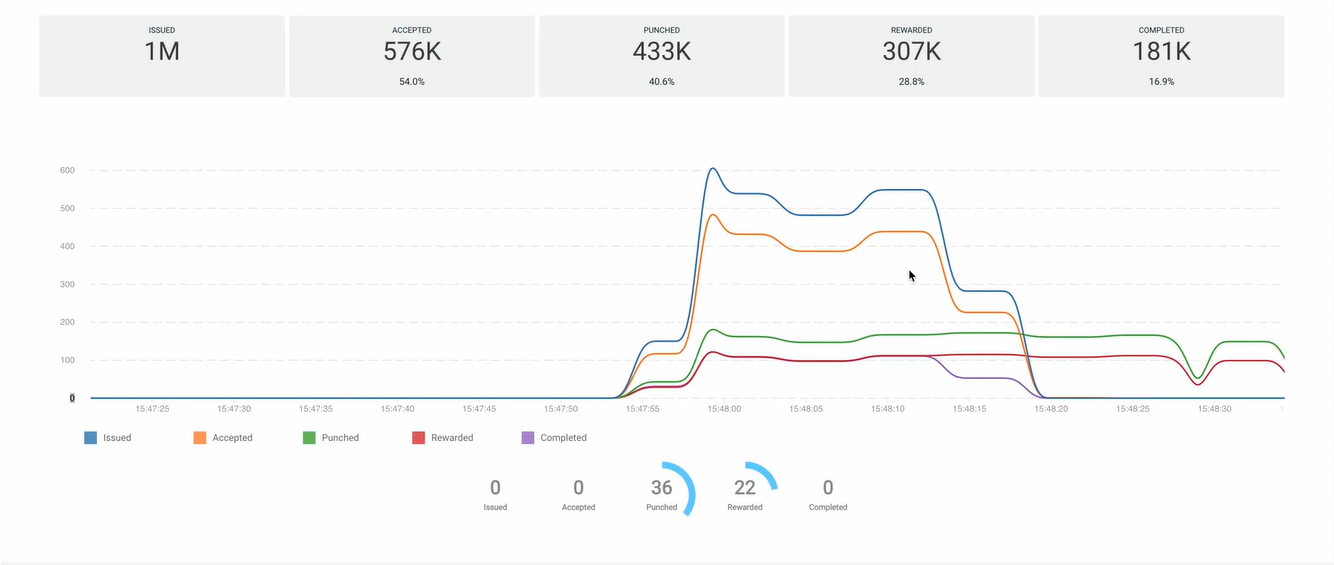 Real-time analytics offers marketers this view, for each Moment specifically. Data is adapted to the type of Moment for which a report is being consulted, meaning when viewing a report for a Cart Abandon Moment will show data on the add item signals, remove item signal, clear cart signal etc, while a report for a Booking Abandon Moment will show data on signals for bookings being started, completed, or updated.