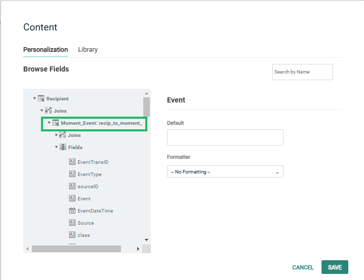 Note: The table Moment_Events, joined to the recipient table, stores the data on event level and can be used as such to personalize your message.