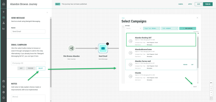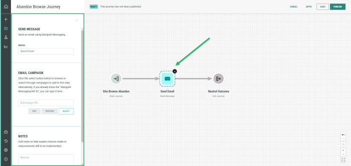 Once the Abandon Browse Journey has been created and configured to launch when a Browse Abandon Moment comes in, you must replace the messages in the journey with your own messages, created in step 2.
