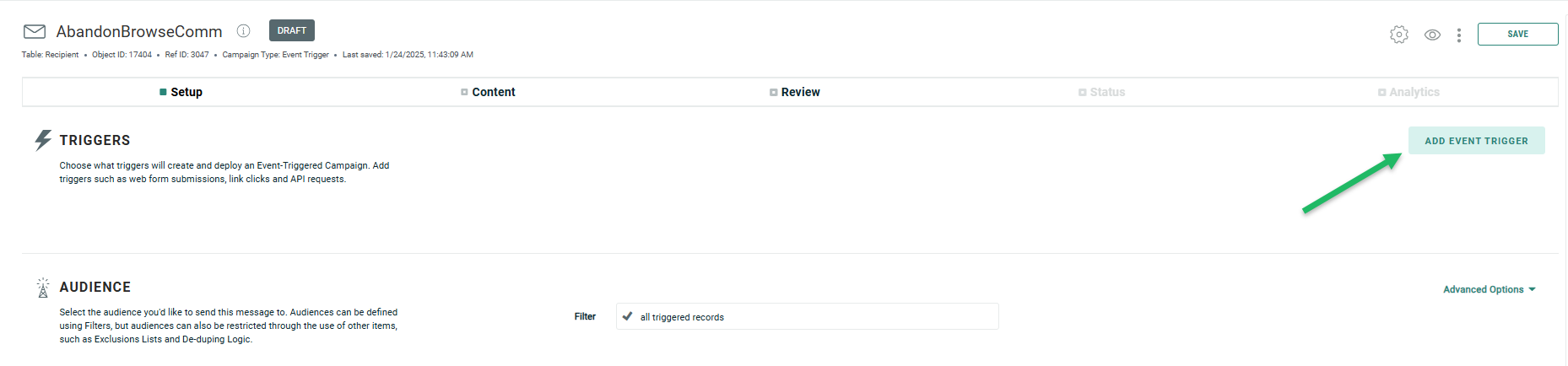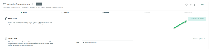 2. The email needs to be set up with Advanced Event Triggering activated to allow these messages to be personalized with data from the event. This is done on the Setup tab of the campaign:
