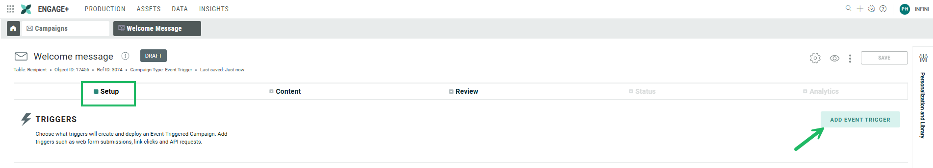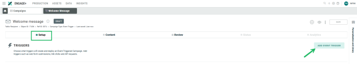 2. The email needs to be set up with Advanced Event Triggering activated to allow these messages to be personalized with data from the event. This is done on the Setup tab of the campaign: