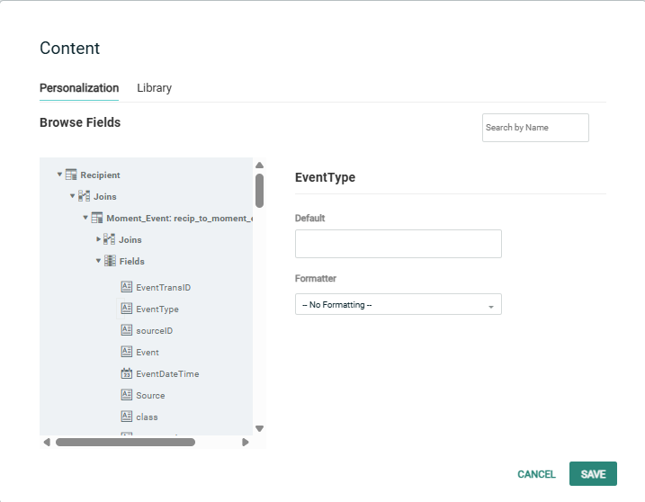 Note: The table Moment_Events, joined to the recipient table, stores the data on event level and can be used directly as such to personalize your message.