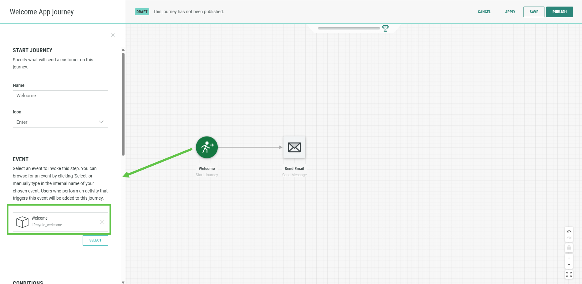 Note: For consistency, all messages used in the journey can be set up with Advanced Event Triggering on. However, when you choose to save the payload of the first email campaign in the journey (this is an option set when adding an email campaign to the journey), you can configure all subsequent messages with Simple Event Triggering on, and only use Advanced Event Triggering for the first email.