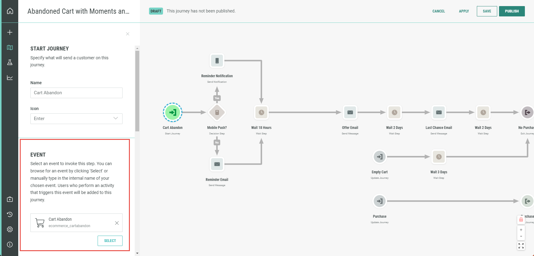 When a Moment occurs in the visitor’s lifecycle, action can be taken. This action is defined outside of the Moments application, in your Engage+ environment. A journey is triggered by a selected Moment and messages are sent out.