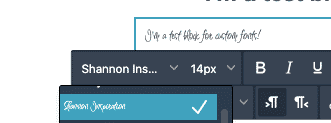 - Text blockCustom fonts are available in the floating editor. While scrolling through the fonts, you'll see a sample of the font in the editor.