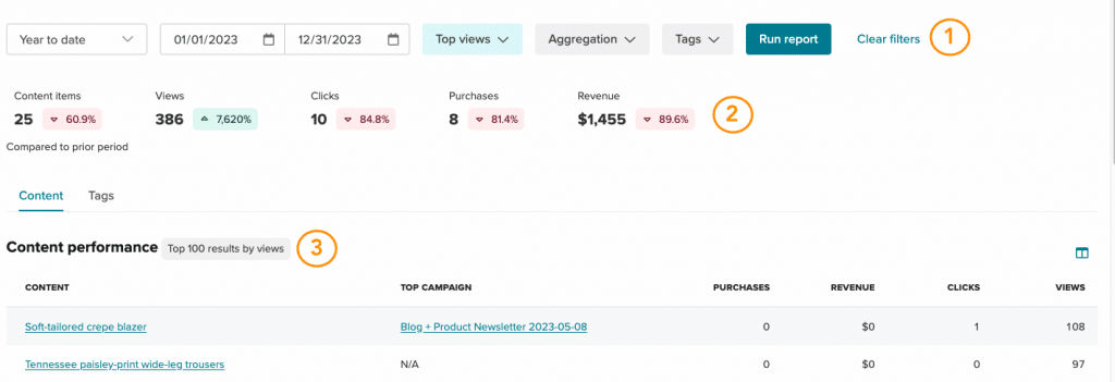 The Content performance table provides data for the top 100 performing content items based on the selected measurement metric, such as views, clicks, purchases, and revenue.