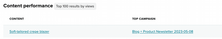 The names of the top 100 performing content items based on the metric that you have selected to measure them by. Will display the URL of the content item if the name is missing, as will happen if the content item has been deleted. Clicking on the name of the content will redirect you to the content item in the content library.Top campaign