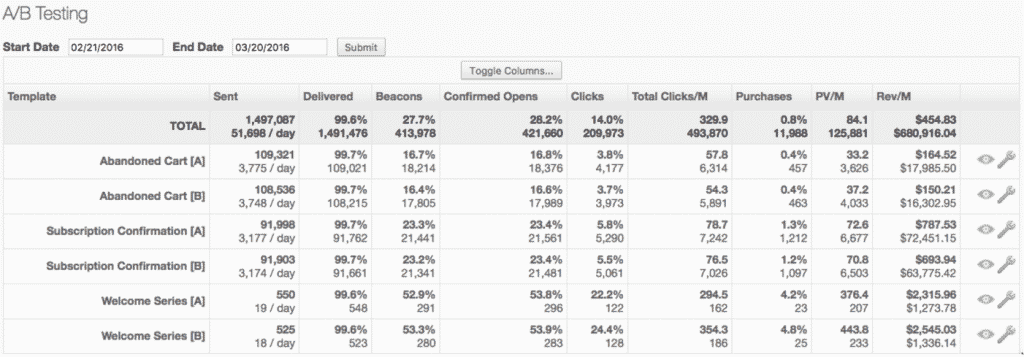 Use the Start Date and End Date entry fields to set the date range. Click on the Download CSV button to download the report.Use the Toggle Columns button to choose column headers in order to turn metrics on or off in your account.