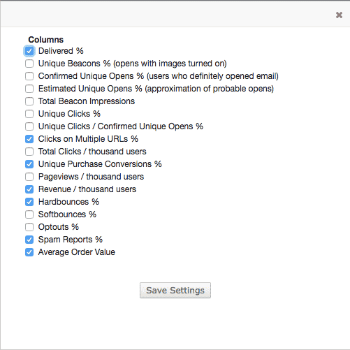 PV/M (pageviews per thousand messages delivered) | The number of pageviews generated by clickthroughs from this campaign, per thousand users messaged. You must implement the Personalization Engine JavaScript on your site in order to track this. |