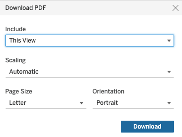 Download a specific view or different sheets from the dashboard or workbook or the underlying data in one of the following formats: image, data, crosstab, PDF, or PowerPoint.- Select the Download