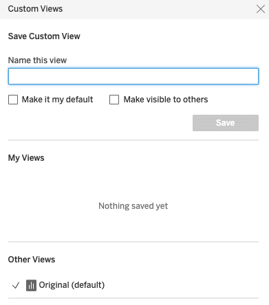 in the toolbar to open the Custom Views modal. - Give your view a name and make it your default view or make it visible to others if you wish. A name is the only required option to save a custom view.