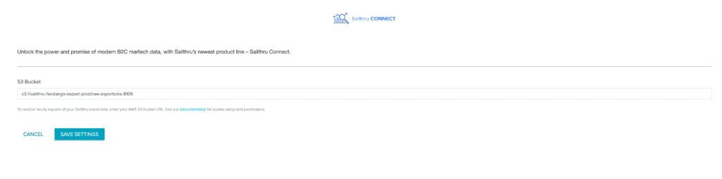 Log in to My Sailthru and configure your S3 bucket in the Settings > Setup > Integrations view. Enter your S3 bucket name in the "Sailthru Connect S3 Bucket".