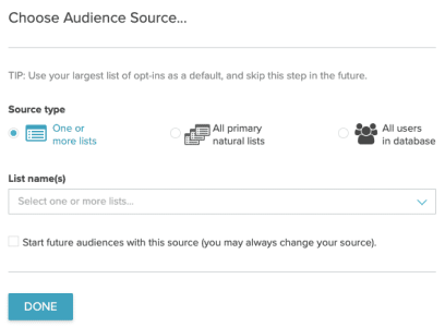 The first screen when you open Audience Builder is the Audience Source selection. This is where you select the list or lists that function as the base of your Smart list.