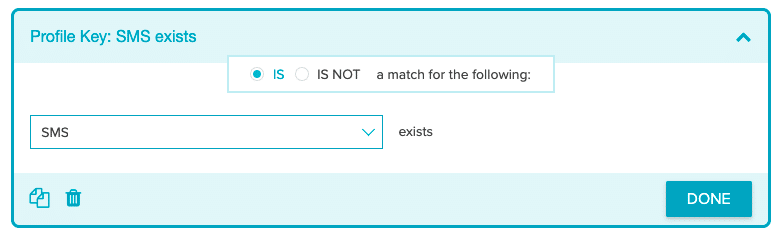 - Select IS for the profile matching and SMS from the drop down. Your filter should resemble the following: