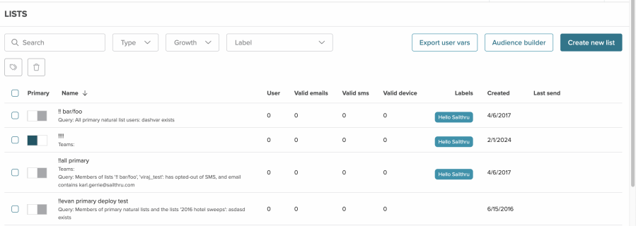 Select the column headers to sort by list name, the number of users, valid emails, valid sms numbers, valid devices, created date, or last used date. The Primary and Labels columns are not sortable.