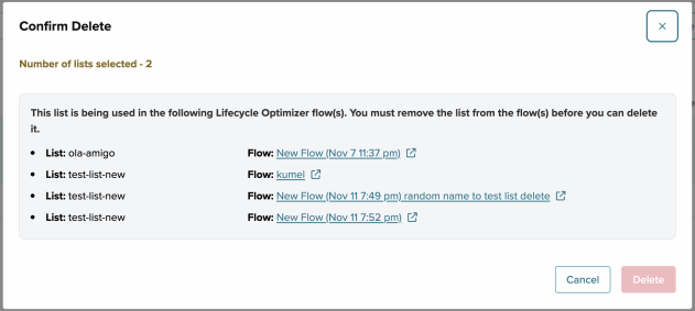• Delete a single list used in Lifecycle Optimizer: