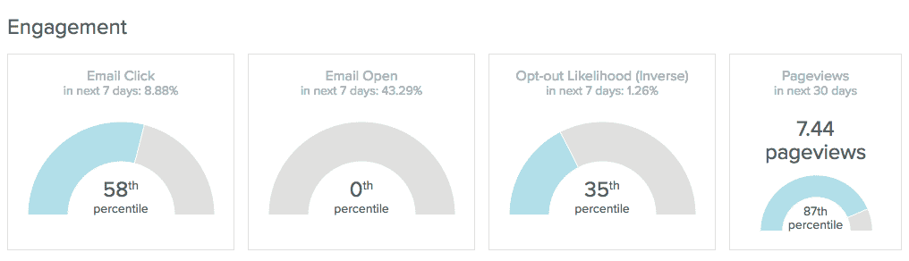 A Prediction Manager subscription is required to use this feature; see the Predictions Overview for more information. The behaviors shown in the Prediction tab include interactions with your content, such as email open rates, opt-outs, and pageviews. Each of the tiles corresponds to a user prediction in the system. For more information on predicted behaviors, see the User Predictions documentation. For key use cases, see the Use Case documentation.
