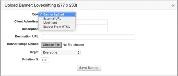 - There are four kinds of uploads: banner, LiveIntent section ID, external URL, and HTML. The fields on the dialog box change to accommodate the information you need to enter to upload for each type.