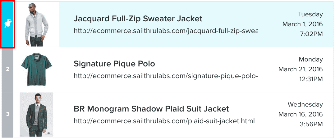 Note that you are pinning the item to a position within the feed. Your template code then has a role in determining how your edited feed sequence and pins are displayed. Some Zephyr functions in your Zephyr template may affect pinning. For more information, please see template requirements for Recommendations Pinning.