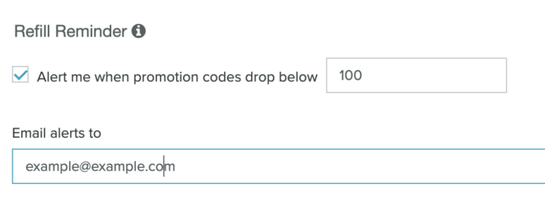 As part of creating a promotion, you can set a custom refill reminder. The reminder will email you when your promotion codes fall below your chosen level.