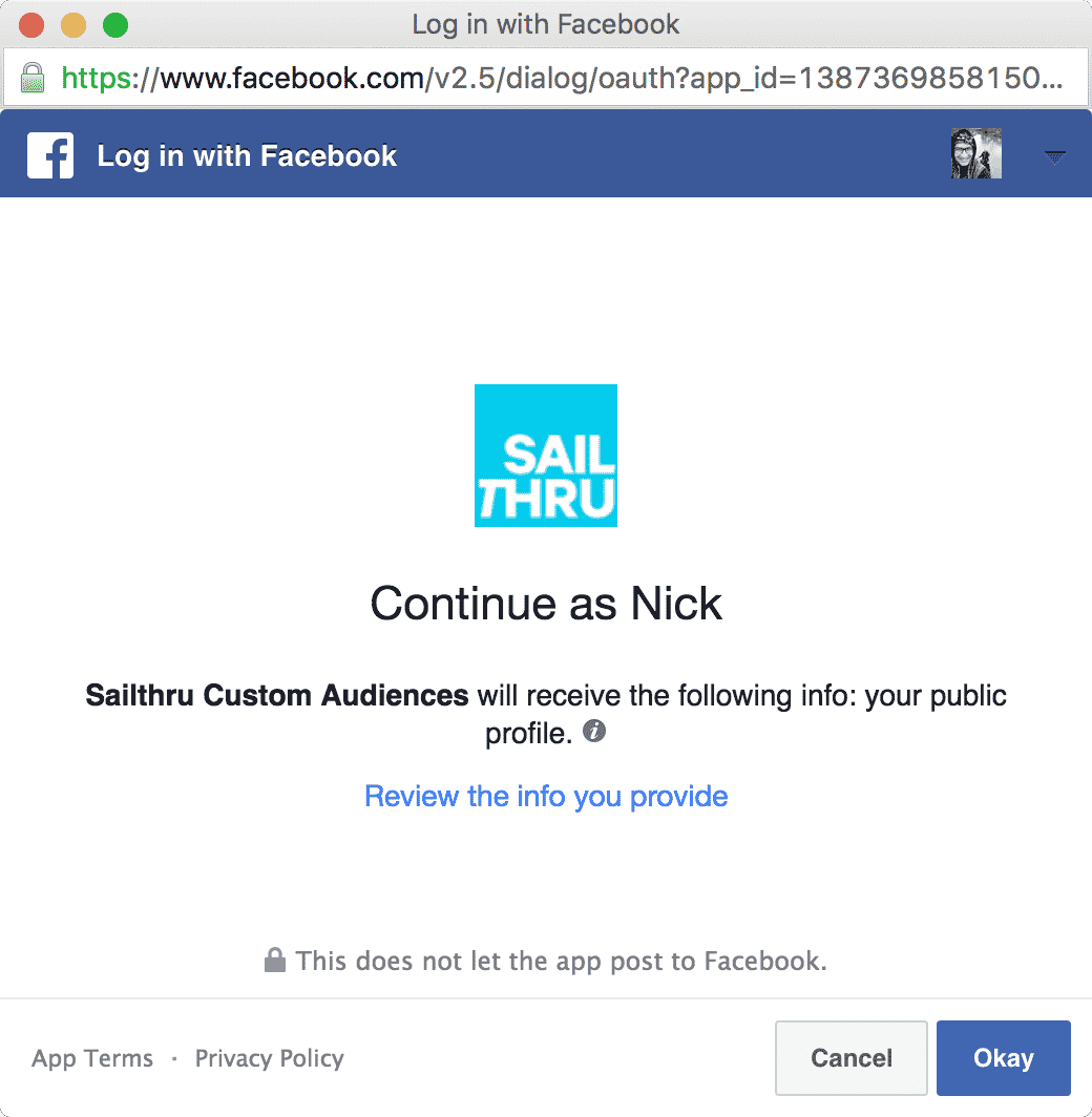 The first time you export a list, a popup window is triggered. You are asked to give the Custom Audiences app permissions to access your public profile and manage your ads. This step is required to be able to push user data into your account. Click Okay.