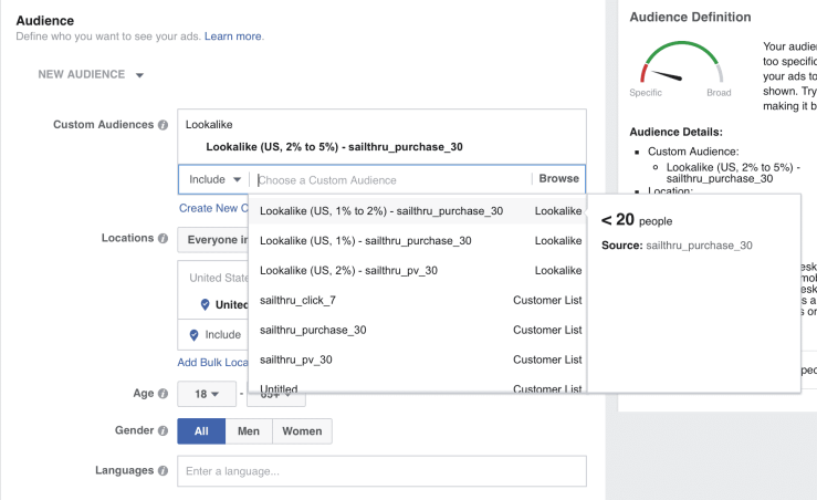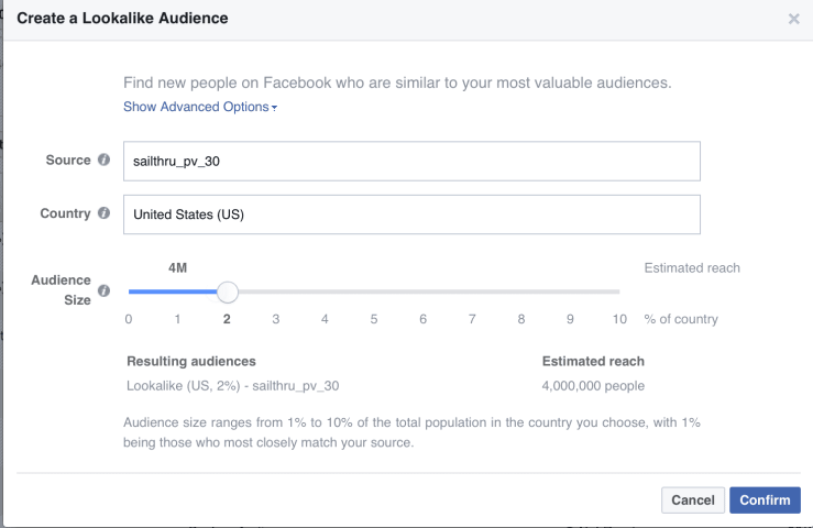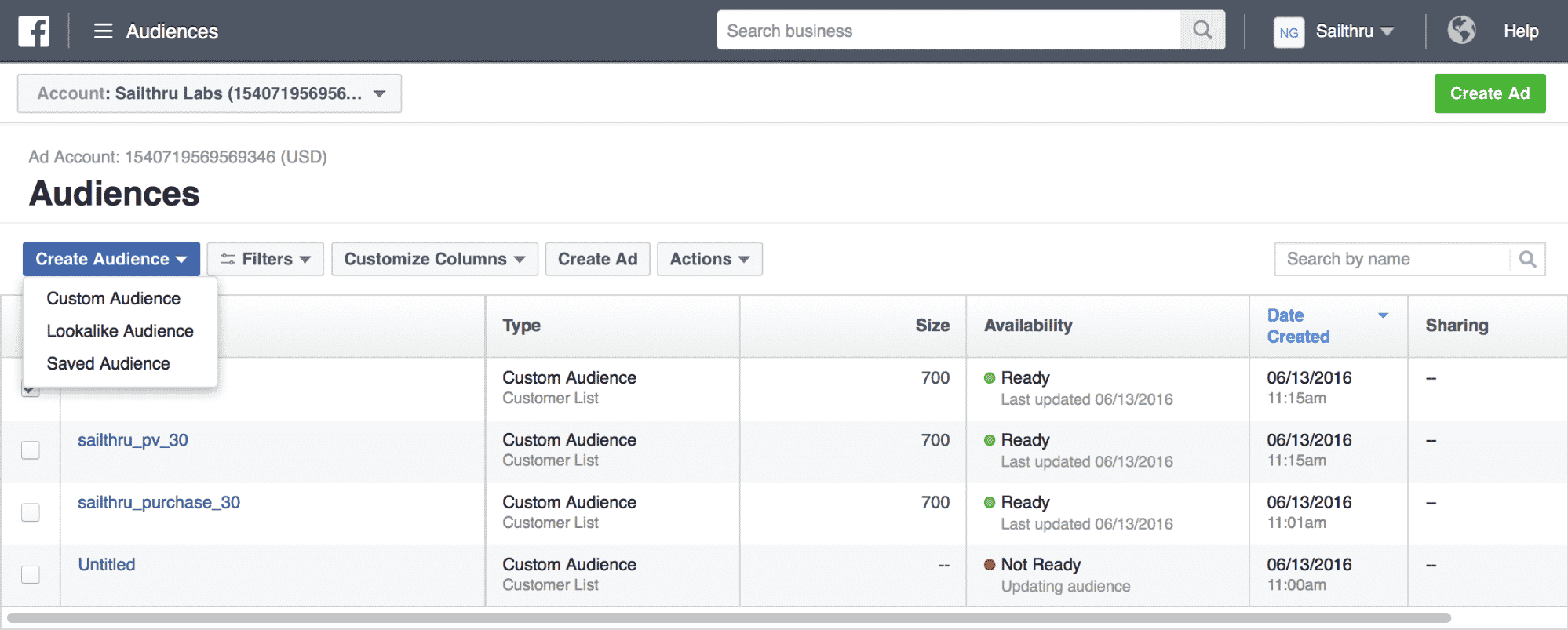 When naming the audience (as it will be displayed in Facebook), choose a name that will allow you to identify it as being sourced from the segment you used. For example “sailthru_click_7” or “sailthru_purchase_30”. This will allow you to quickly see which audiences have come from Sailthru and create lookalikes.