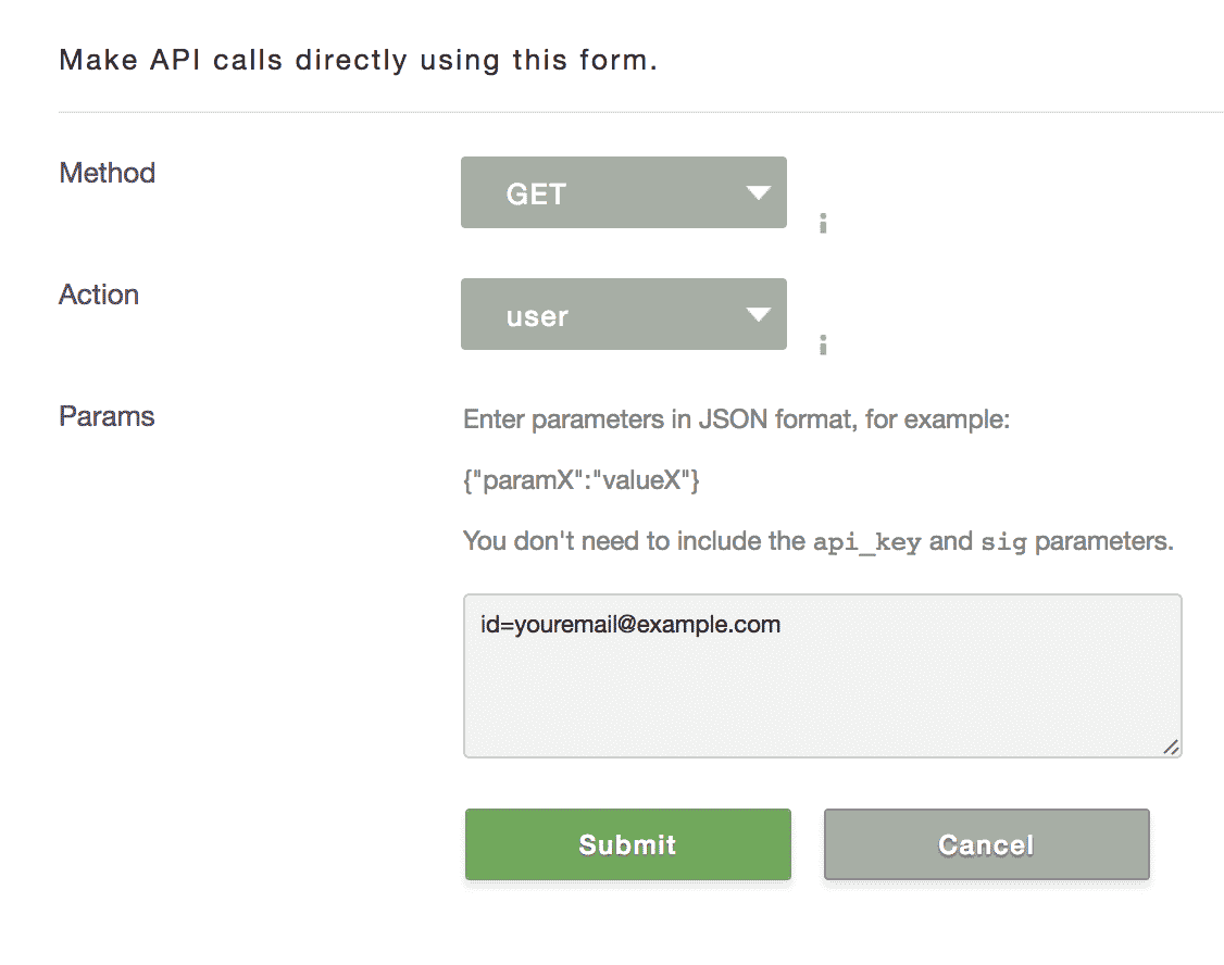 Log in to your Sailthru account at my.sailthru.com, click the settings icon, and click API Test. Then make a GET request for the user API endpoint, specifying a test email address. If the test user does not yet exist, you can make an identical POST request first.
