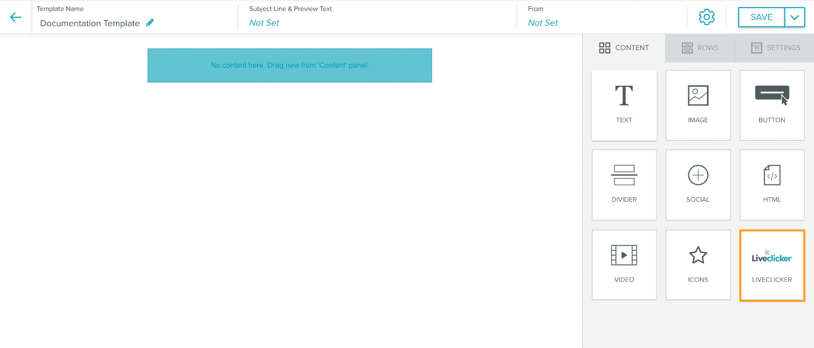 - Drag and drop the Liveclicker content block into your template canvas.
