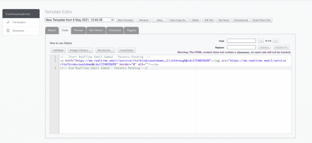 - In the Code tab, click on the Liveclicker button.