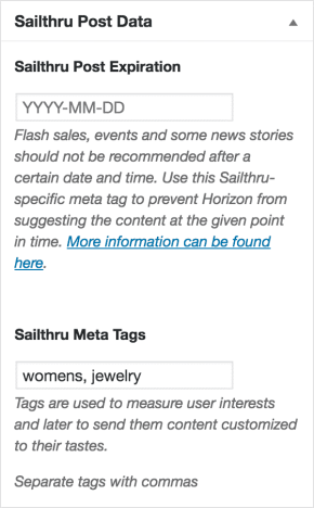 Sometimes you do not want your content displaying in future recommendations. So for each post/page you'll be able to set the content expiry date. This will tell Sailthru to remove this piece of content from Sailthru recommendations after the set date.