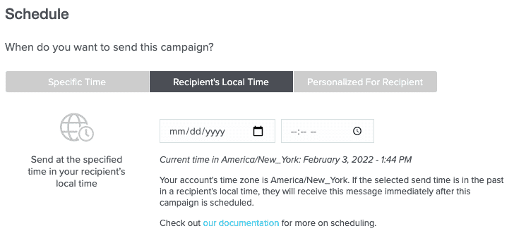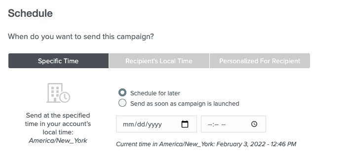 On the Schedulepage, set up all options around how and when your email will be sent.There are three options available for scheduling your campaign send: Specific Time, Recipient's Local Time, and Personalized for Recipient.