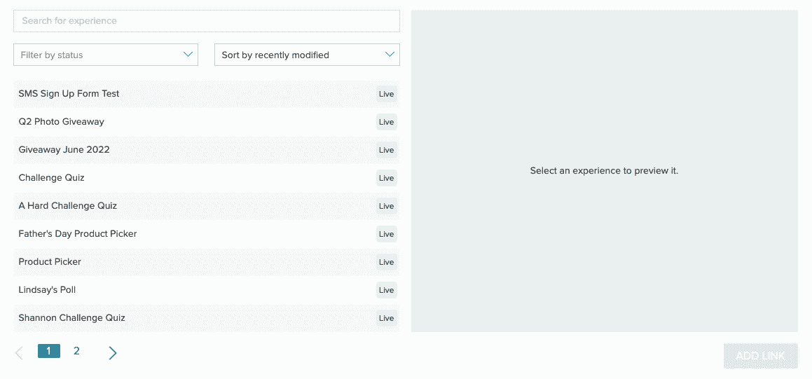 When you select one from the list, you'll see it in the Preview window. The preview also gives you the URL and shows when the experience was last updated.
