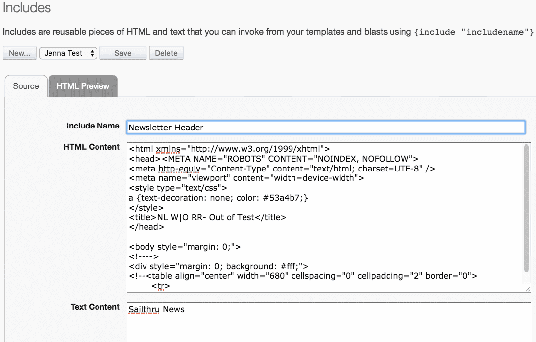Includes are reusable segments of code or content that you can use throughout your templates and email campaigns. The most common use of an include is to create a standard header or footer to use across multiple templates. When you need to make a change, you can just edit a single include rather than making changes manually across all of the affected templates.
