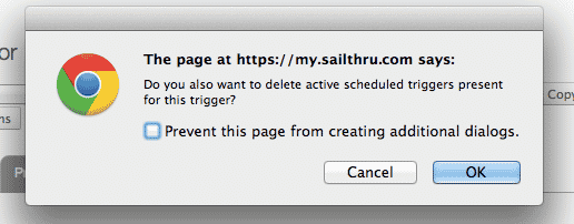 If you have any Triggers that haven't executed yet, you'll be prompted to confirm if you want to delete any scheduled Triggers that haven't executed yet. Clicking "Cancel" deletes the Trigger from the template, but keeps the scheduled Triggers; Clicking "OK" deleted the Trigger from the template and the scheduled Triggers.